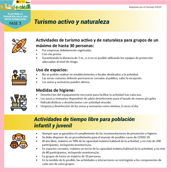 La Orden SND/458/2020, de 30 de mayo, para la flexibilización de determinadas restricciones de ámbito nacional establecidas tras la declaración del estado de alarma en aplicación de la fase 3 del Plan para la transición hacia una nueva normalidad detalla diferentes condiciones relacionadas con el sector de la actividad físico-deportiva y que afectan de una manera u otra a los educadores físicos y sus centros de trabajo.